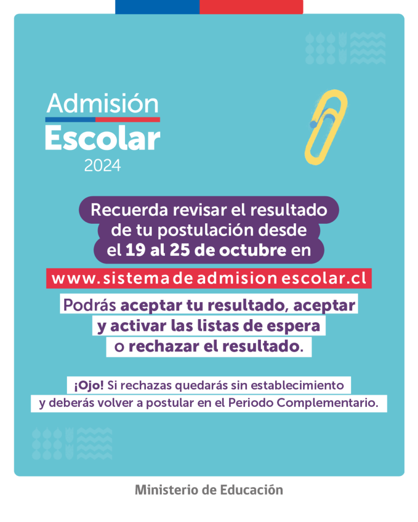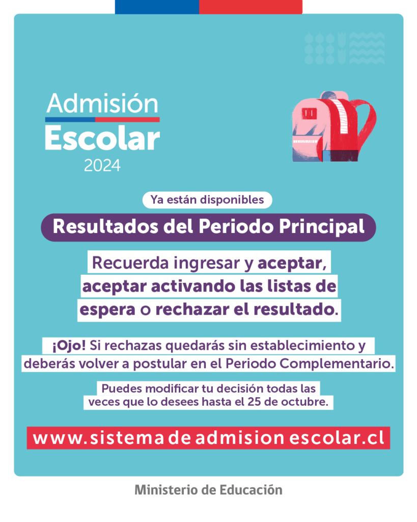 Ya estan disponibles los resultados del periodo principal de postulación para la Admisión Escolar del año académico 2024. Esta información se puede conocer a través de la plataforma web www.sistemadeadmisionescolar.cl ingresando con las credenciales de usuario creadas al momento de postular.