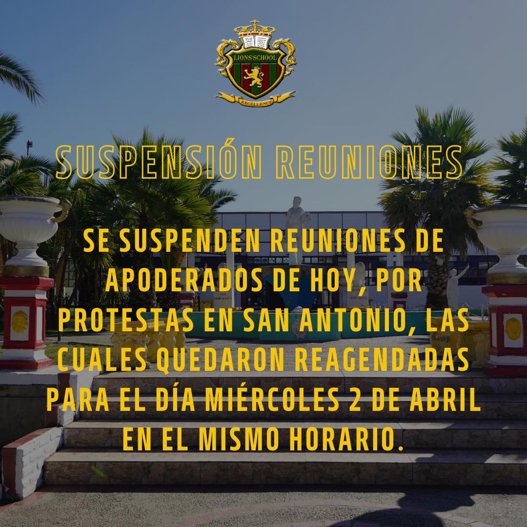 Se suspenden reuniones de apoderados de hoy, por protestas en San Antonio, las cuales quedaron reagendadas para el día miércoles 2 de abril en el mismo horario.
